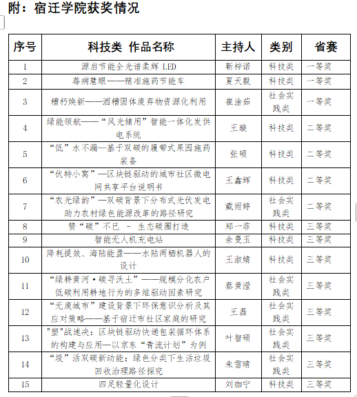 江苏省大学生节能减排社会实践与科技竞赛是江苏省本专科生学科竞赛省级赛事认定项目,竞赛积极响应国家“碳达峰”“碳中和”战略目标,旨在增强全省高校学生的节能减排意识、科技创新意识和团队协作意识,扩大学生科学视野,提高学生创新设计能力、工程实践能力和社会调查能力,达到以赛促学、以赛促教的效果。本次竞赛主赛道省内参赛高校院所共53家,经过选拔共报名省赛1951件作品。经初审、网评、专家会评,共遴选出获奖项目561个,宿迁学院15个项目获奖。